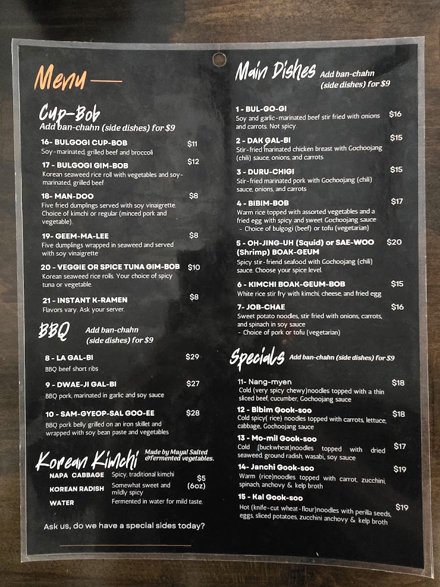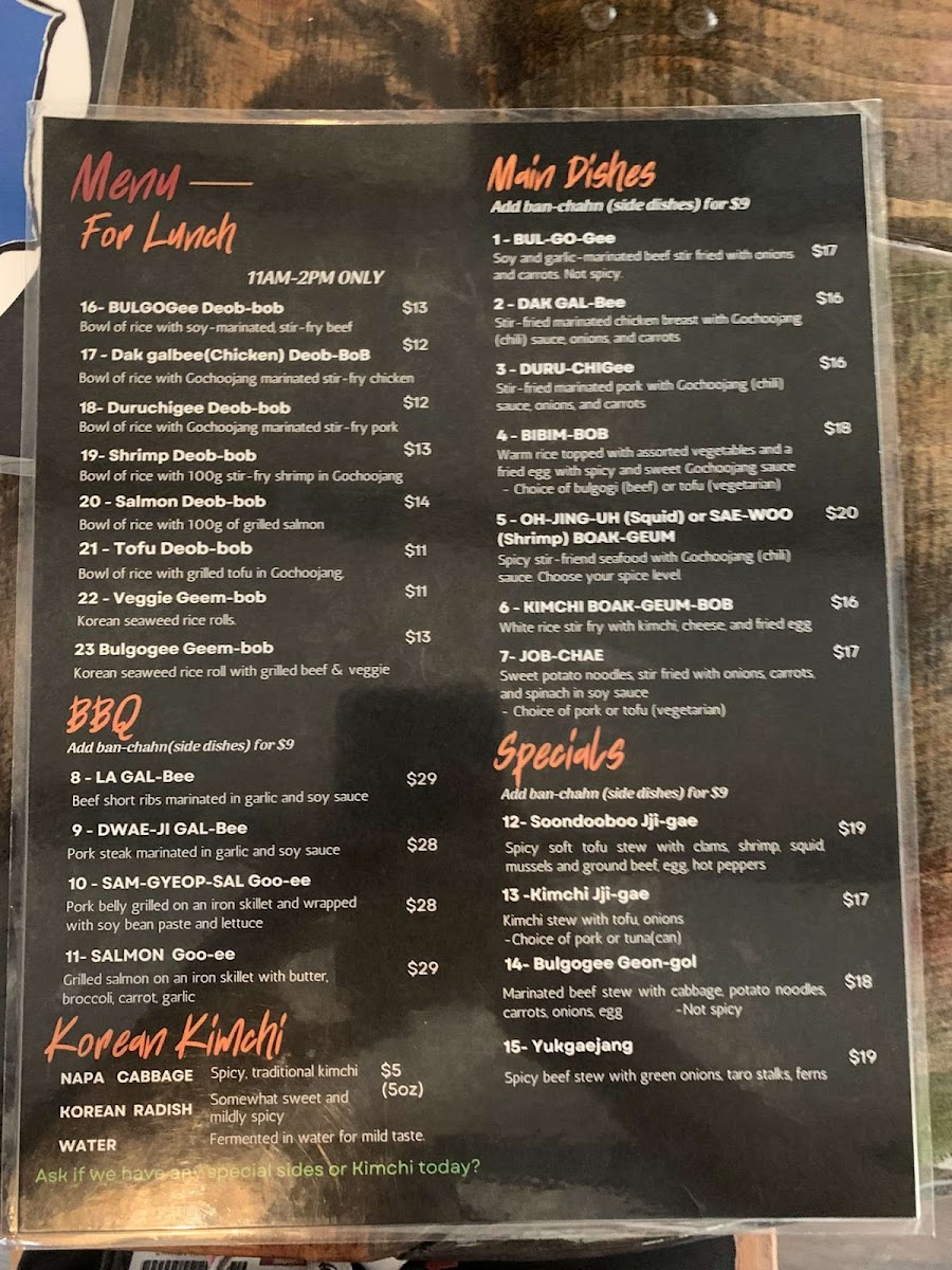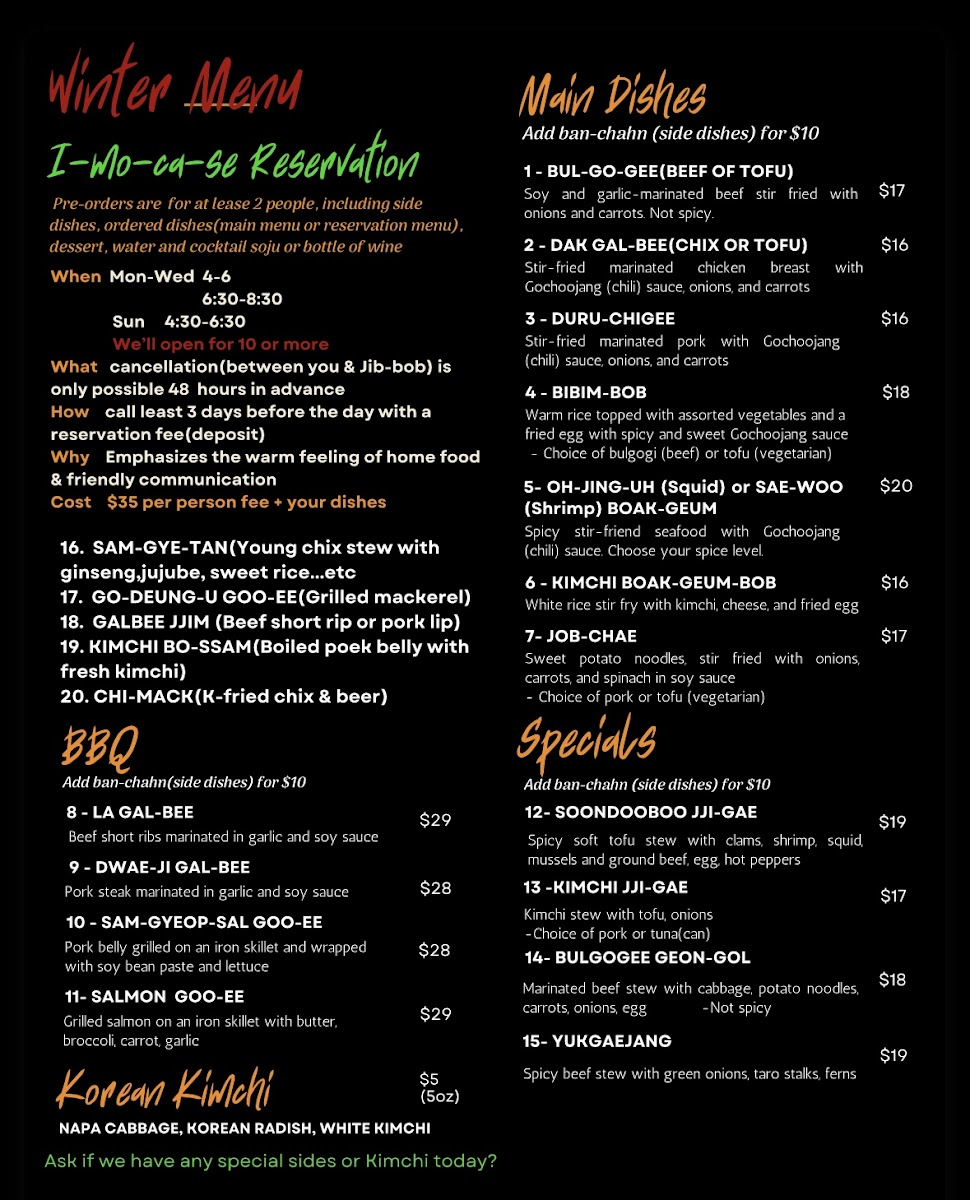 When you step into Jib-Bob Korean Restaurant Menu, you're in for a flavorful journey that brings the best of Korean cuisine to Mt Pleasant. With an inviting atmosphere and a menu that offers a perfect balance of savory and spicy, there's something for everyone. From the rich and aromatic flavors of bibimbap to the sizzling goodness of bulgogi, every dish is crafted to perfection. Their signature Korean BBQ allows you to grill your own meat at the table, adding an interactive experience to your meal. Whether you're craving a warm bowl of kimchi stew or looking to try something new, the variety here ensures a memorable dining experience. Don't forget to pair your meal with some traditional sides like crispy spring rolls or refreshing kimchi to complete the experience. At Jib-Bob, every bite transports you to the heart of Korea.