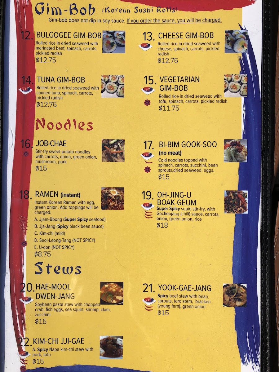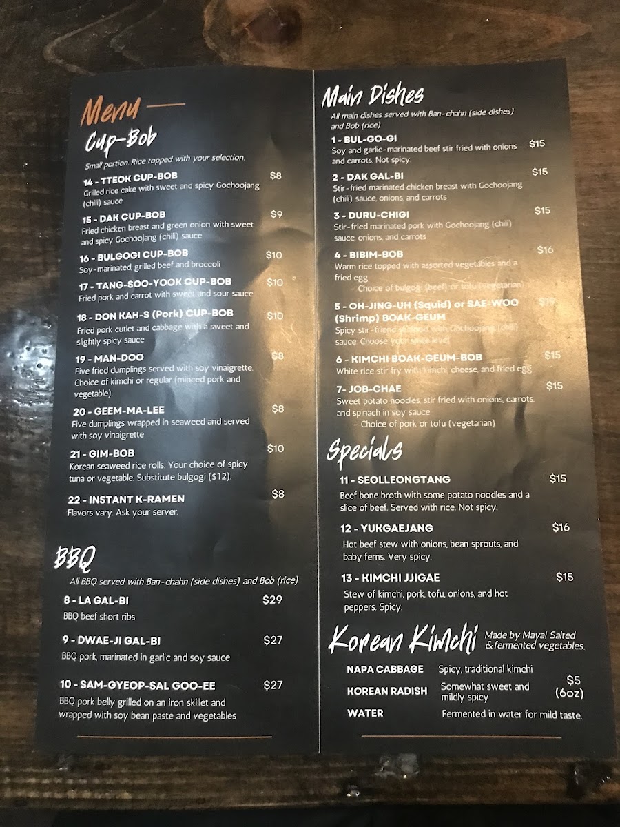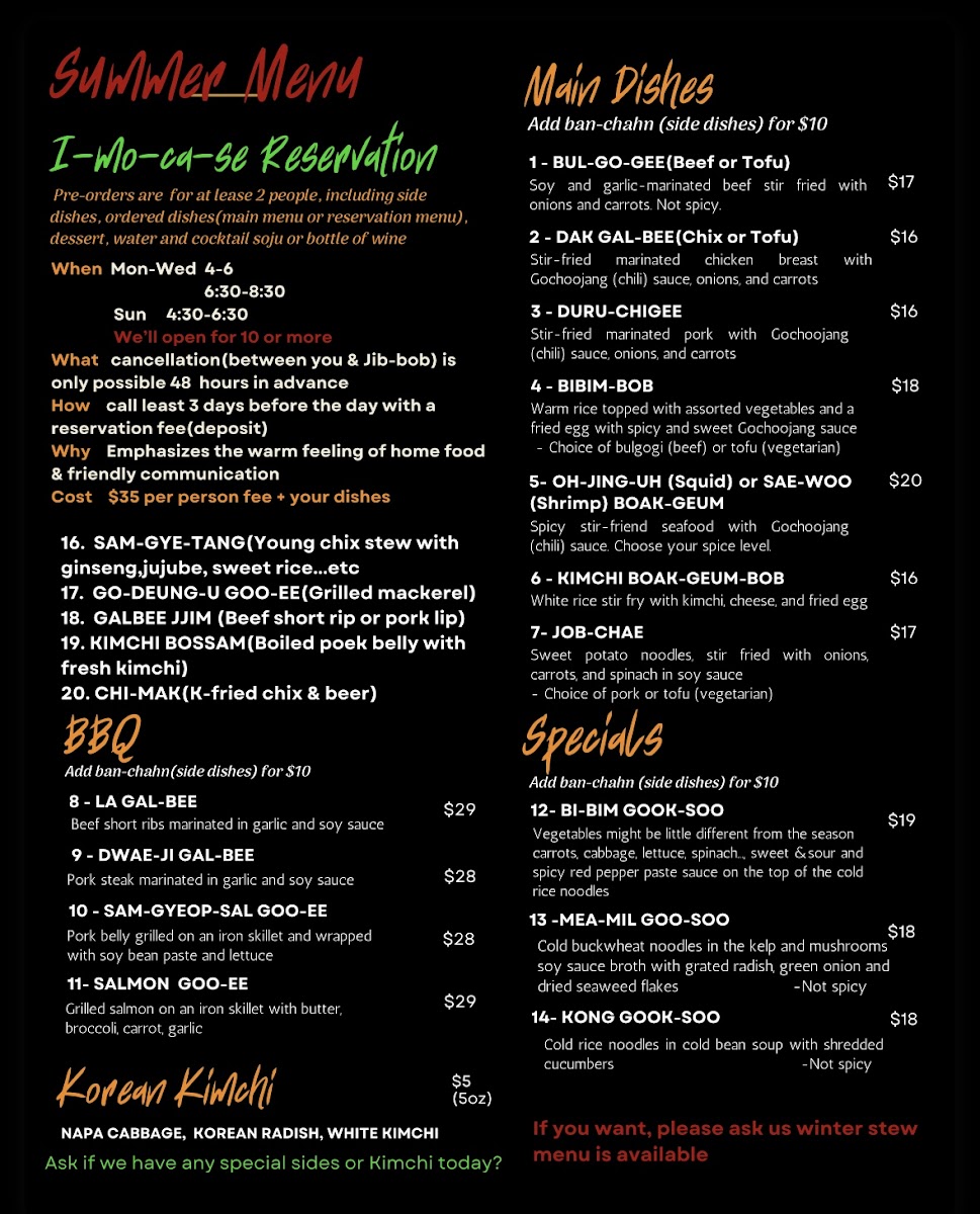 When you step into Jib-Bob Korean Restaurant Menu, you're in for a flavorful journey that brings the best of Korean cuisine to Mt Pleasant. With an inviting atmosphere and a menu that offers a perfect balance of savory and spicy, there's something for everyone. From the rich and aromatic flavors of bibimbap to the sizzling goodness of bulgogi, every dish is crafted to perfection. Their signature Korean BBQ allows you to grill your own meat at the table, adding an interactive experience to your meal. Whether you're craving a warm bowl of kimchi stew or looking to try something new, the variety here ensures a memorable dining experience. Don't forget to pair your meal with some traditional sides like crispy spring rolls or refreshing kimchi to complete the experience. At Jib-Bob, every bite transports you to the heart of Korea.